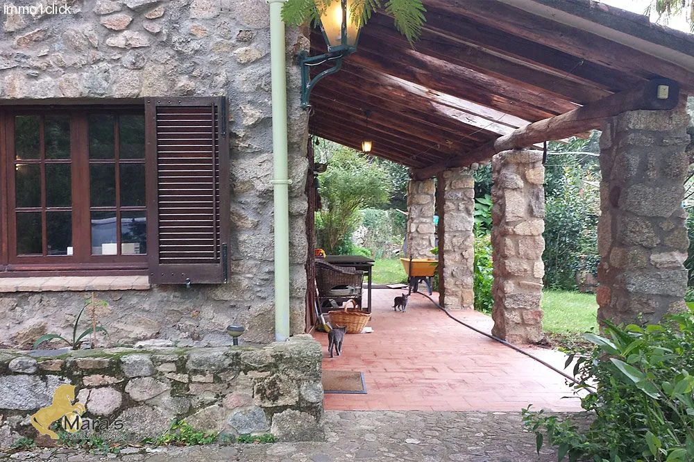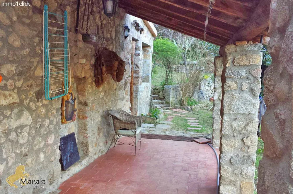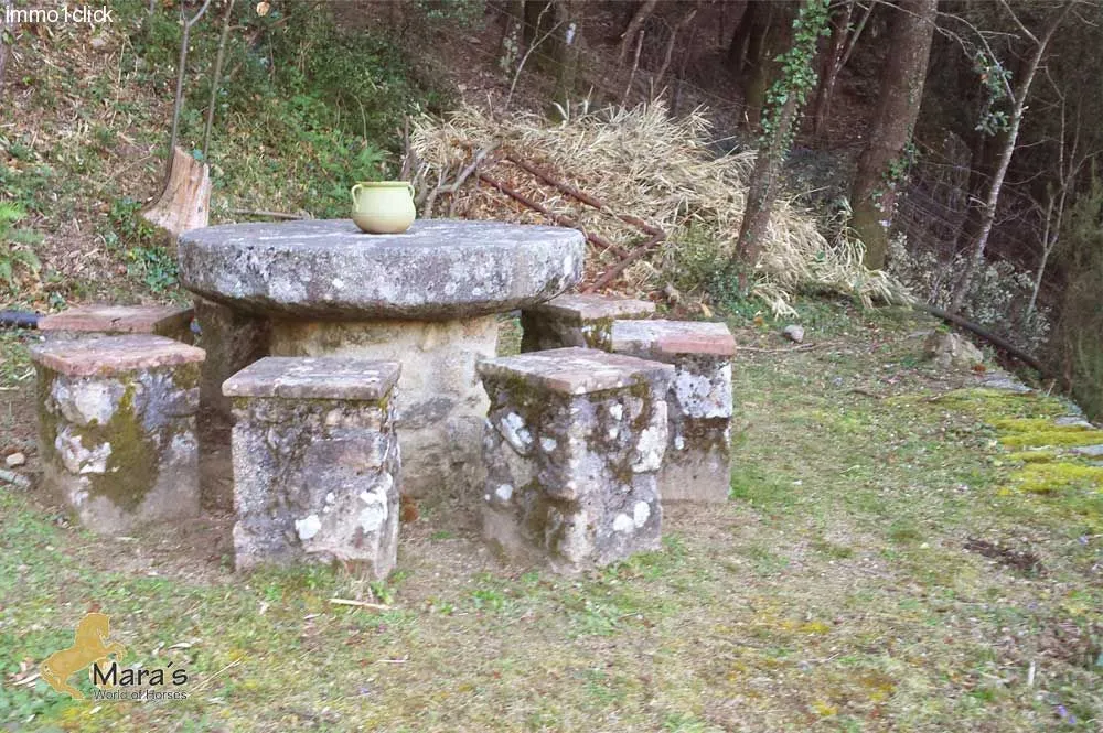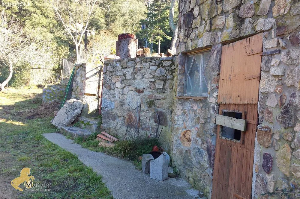 La puerta de entrada abre a una típico terraza catalana donde también se encuentra una casita con horno de pan. Esta casita fácilmente puede ser transformada en una cocina de verano con vista al arroyo más abajo. Más abajo aún hay varias casitas de almacén que antiguamente servían de cuadras para las cabras.